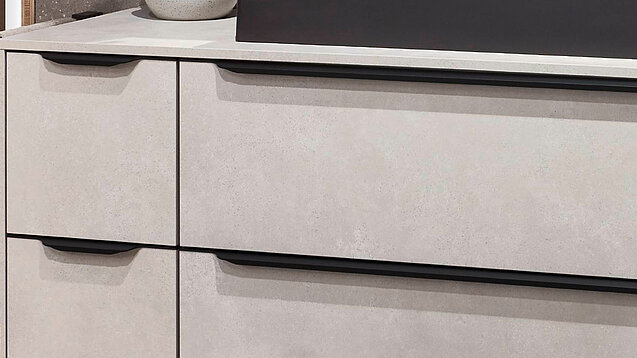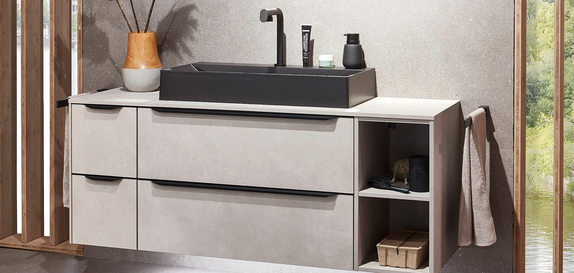 Color makes all the difference. The concrete shade of sand is an exciting and soft alternative to classic shades of grey in bathroom design. Black fittings and handles create a harmonious effect and focus on the surface texture.