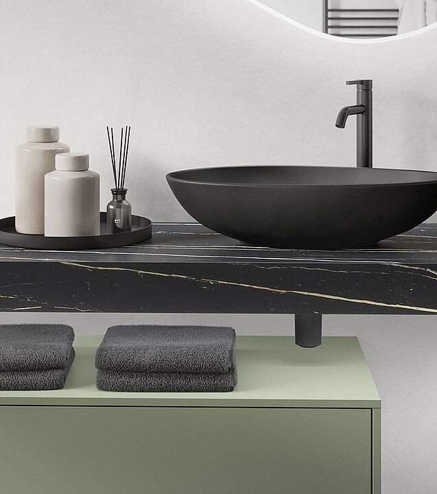 In combination with contrasting straight and curved lines, the natural colour olive creates a wonderfully balanced atmosphere in the bathroom. Colours, shapes and materials flow into one another and promote an inviting sense of calm and comfort. Black elements add a touch of urban flair and lend the ambience a modern lightness.