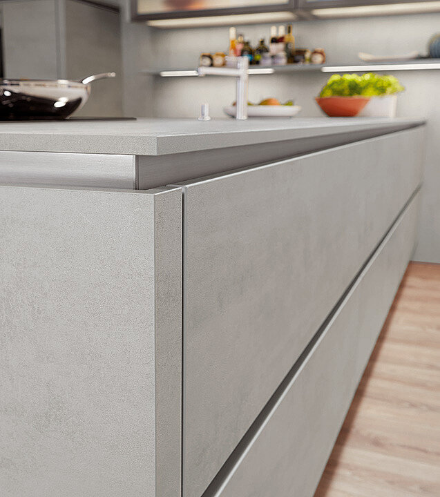 Concrete has established itself not only in architecture, but also in interior design. The fronts with an authentic-looking concrete appearance are an interesting and easy care material alternative for the kitchen and living area and convey a modern urban feel. Whether a puristic design with exclusively concrete finishes – as in this example – or combined with warm wood, either way, this model achieves a trend-oriented kitchen ambience.