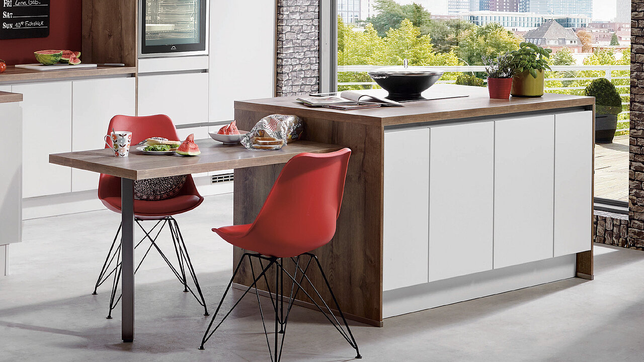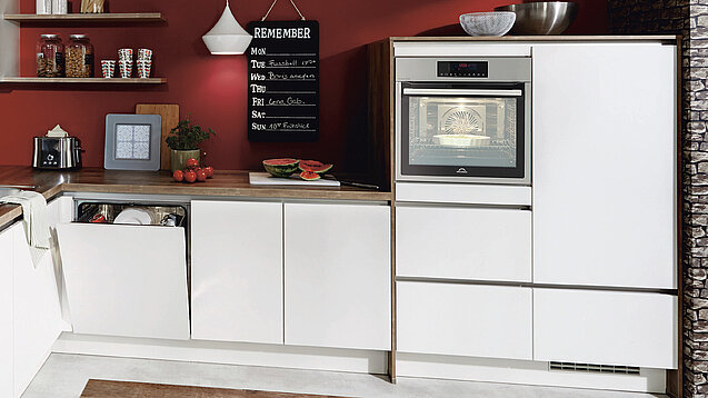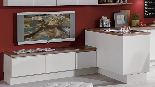 Today, the kitchen is the heart of the home/of where we live. The borders between cooking, eating, and living have long disappeared – rooms and their functions merge together more and more. The sleek elegance of the White Laser fronts are stunningly emphasised by the surround in trendy Canadian oak reproduction. The discreetly illuminated segmented glass units produce a subtle mood lighting and enhance the transition into the living room.