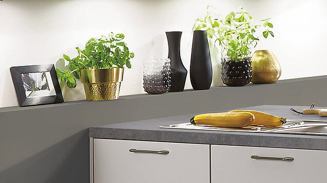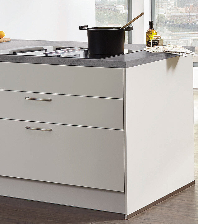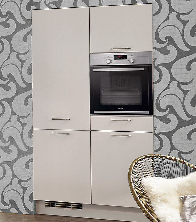 This compact, functional kitchen is ideal for minimalists and first-time buyers. Timeless, due to its softmatt fronts in popular lacquered laminate. Ergonomic, with raised built-in oven. Easy care due to intelligent surface design. And with niche cladding boasting a digitally printed Vector Art motif, it is also a focal point.