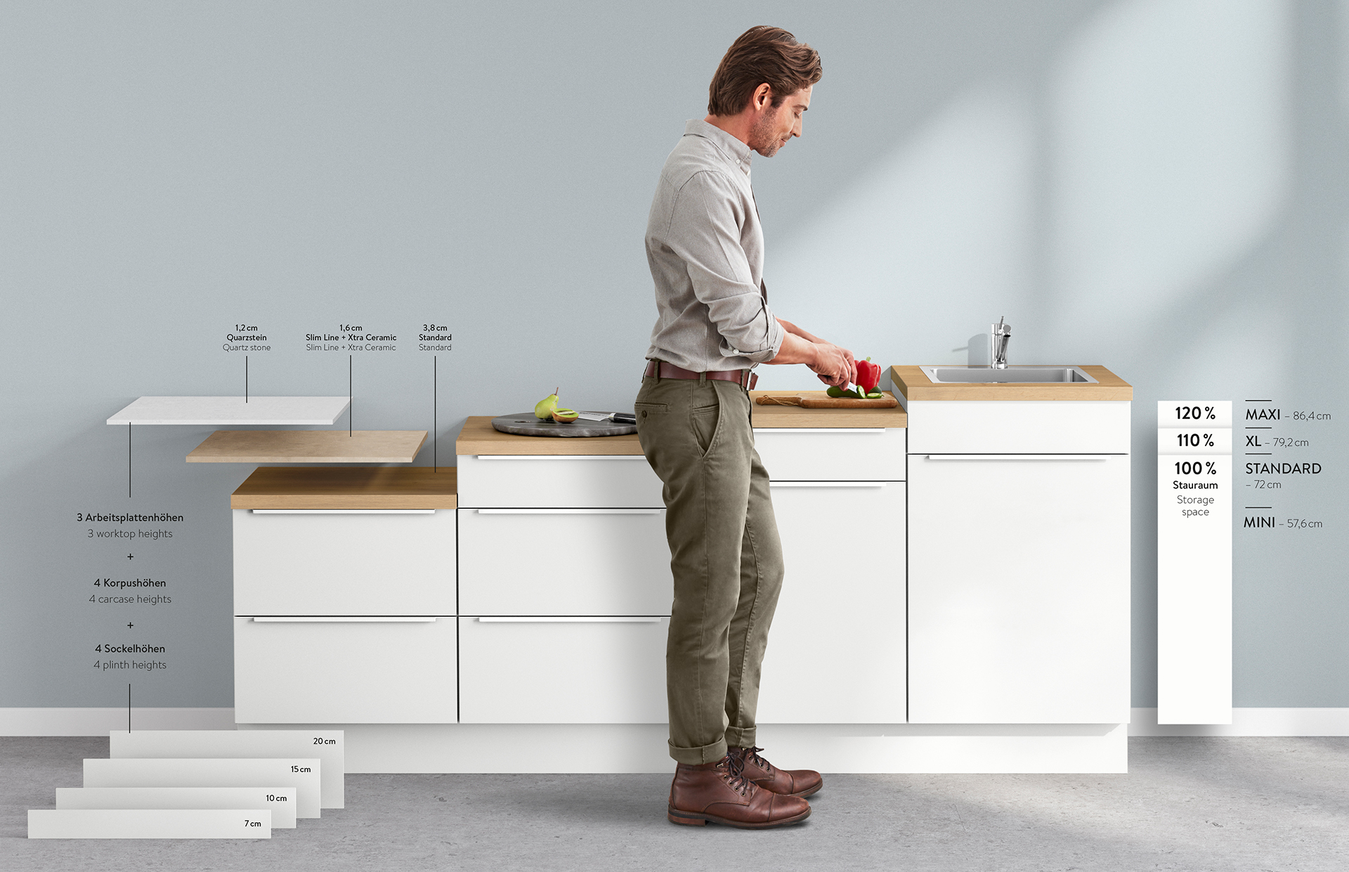 This makes your daily kitchen work more relaxed and is easy on your back. Everything is possible! We offer the perfect kitchen solution for every individual need and every room with 3 base unit heights in standard, XL and Maxi height. The combination of base units and plinth heights not only optimises the ergonomics and results in more storage, but also adapts flexibly to any spatial situation in an old-build or new-build house.